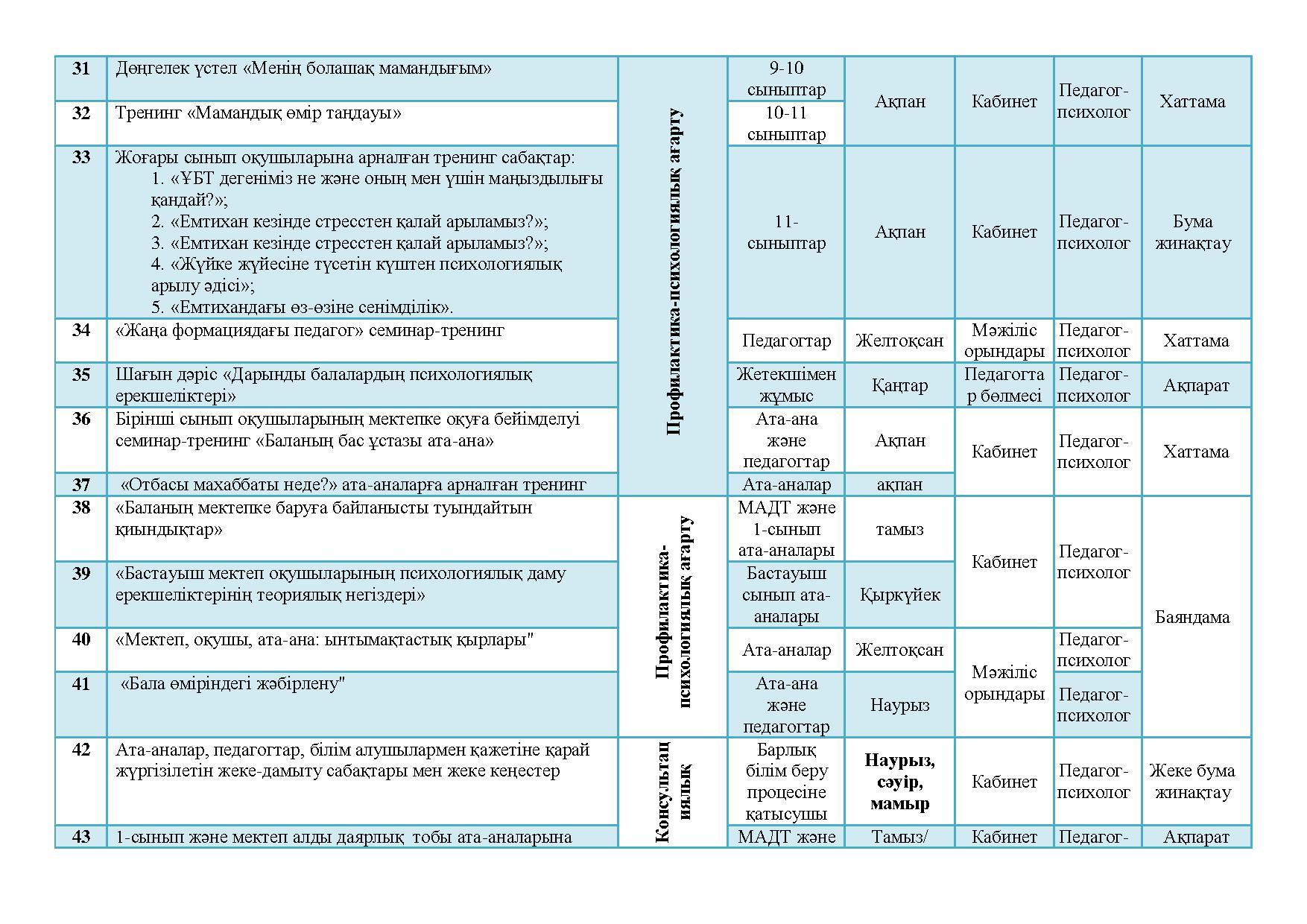 27 июнь 2023 0 1 2 3 4 5 Психологиялық қызметтің жоспары (5-11 сыныптар) Қазақстан Республикасы Оқу-ағарту министрінің 2023 жылғы 17 наурыздағы № 68 бұйрығы негізінде жасалған