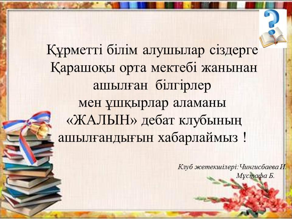 "Жалын" дебат клубы » Жетісу облысы Кербұлақ ауданы Қарашоқы орта мектебі
