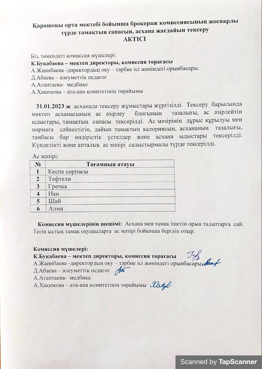 Асхана жағдайын тексеру АКТІСІ » Жетісу облысы Кербұлақ ауданы Қарашоқы орта мектебі