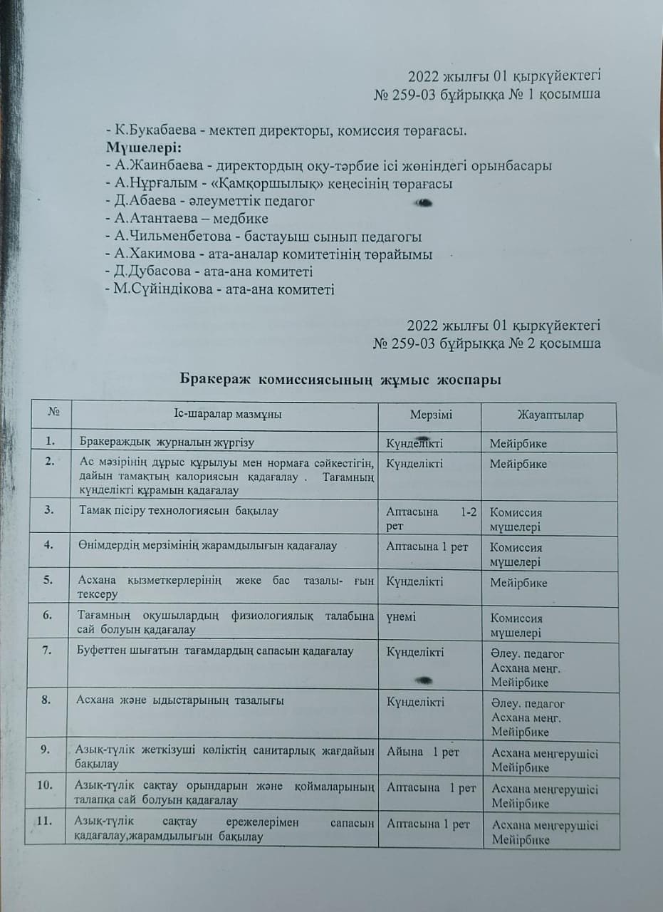 Бракераж комиссиясының жұмысын ұйымдастыру туралы бұйрық » Жетісу облысы Кербұлақ ауданы Қарашоқы орта мектебі