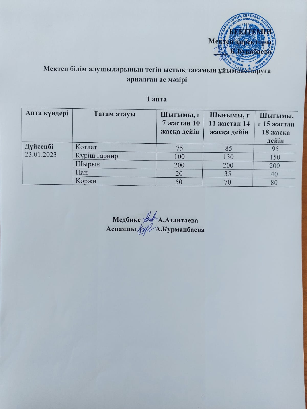 Күнделікті ас мәзірі » Жетісу облысы Кербұлақ ауданы Қарашоқы орта мектебі